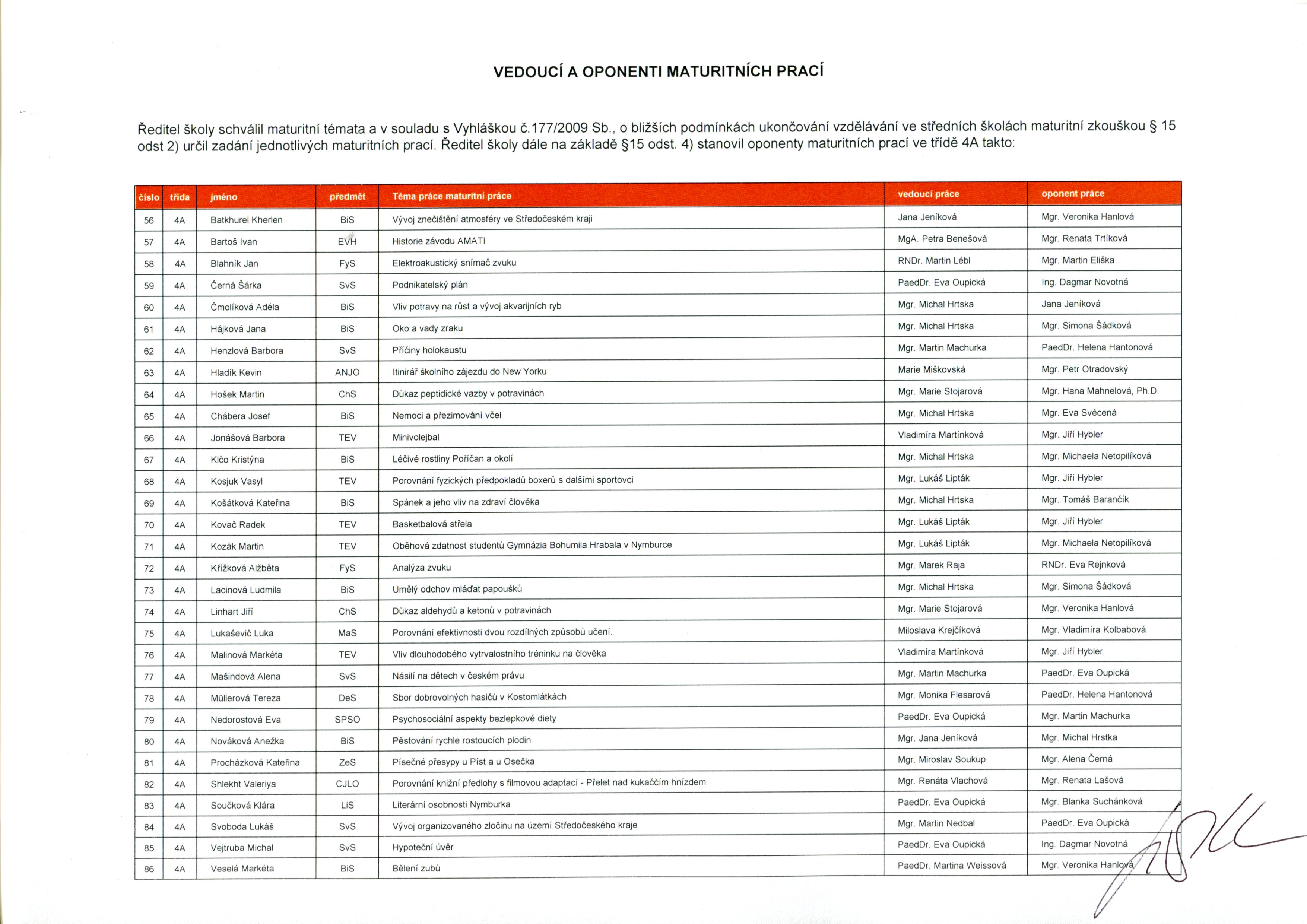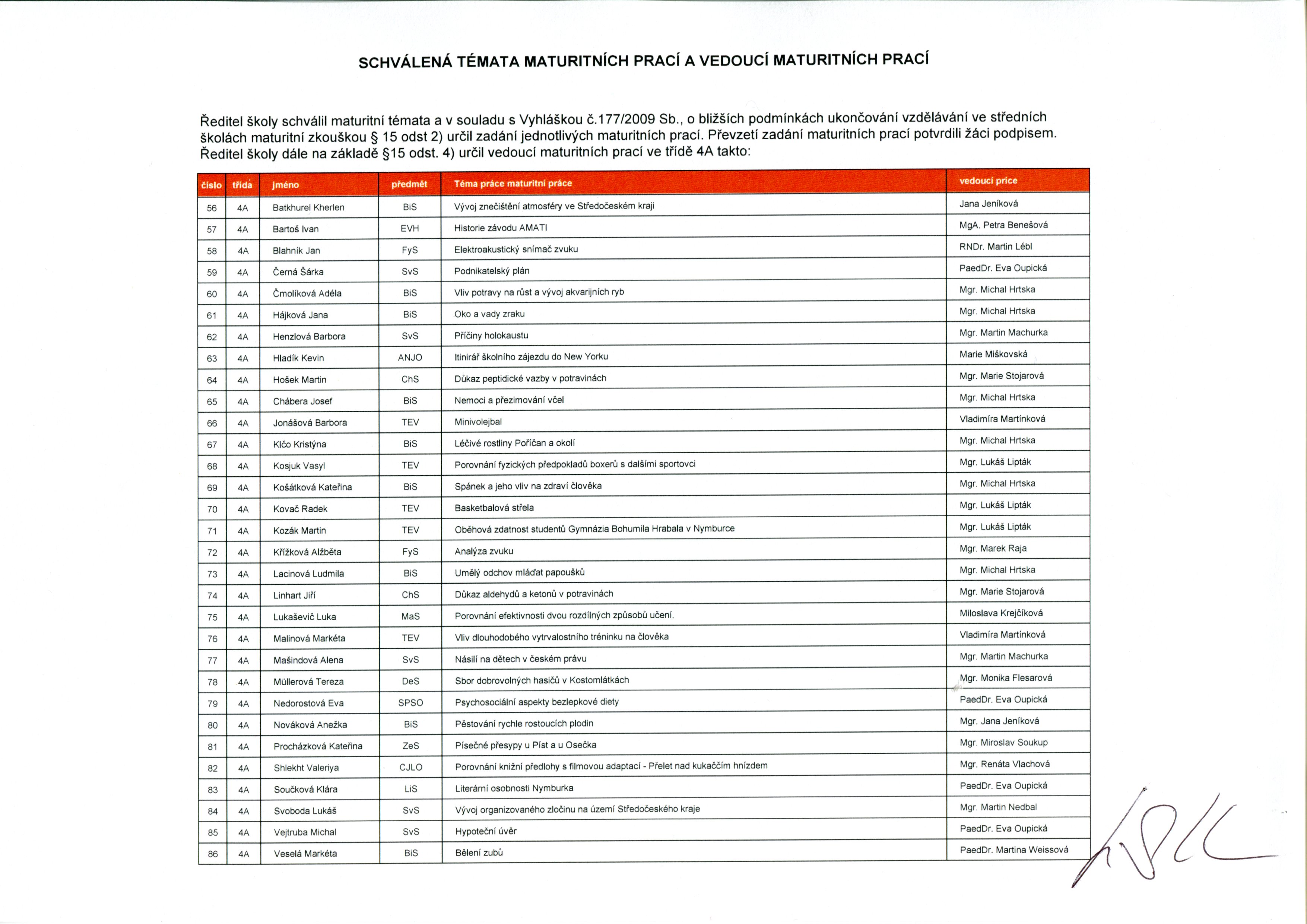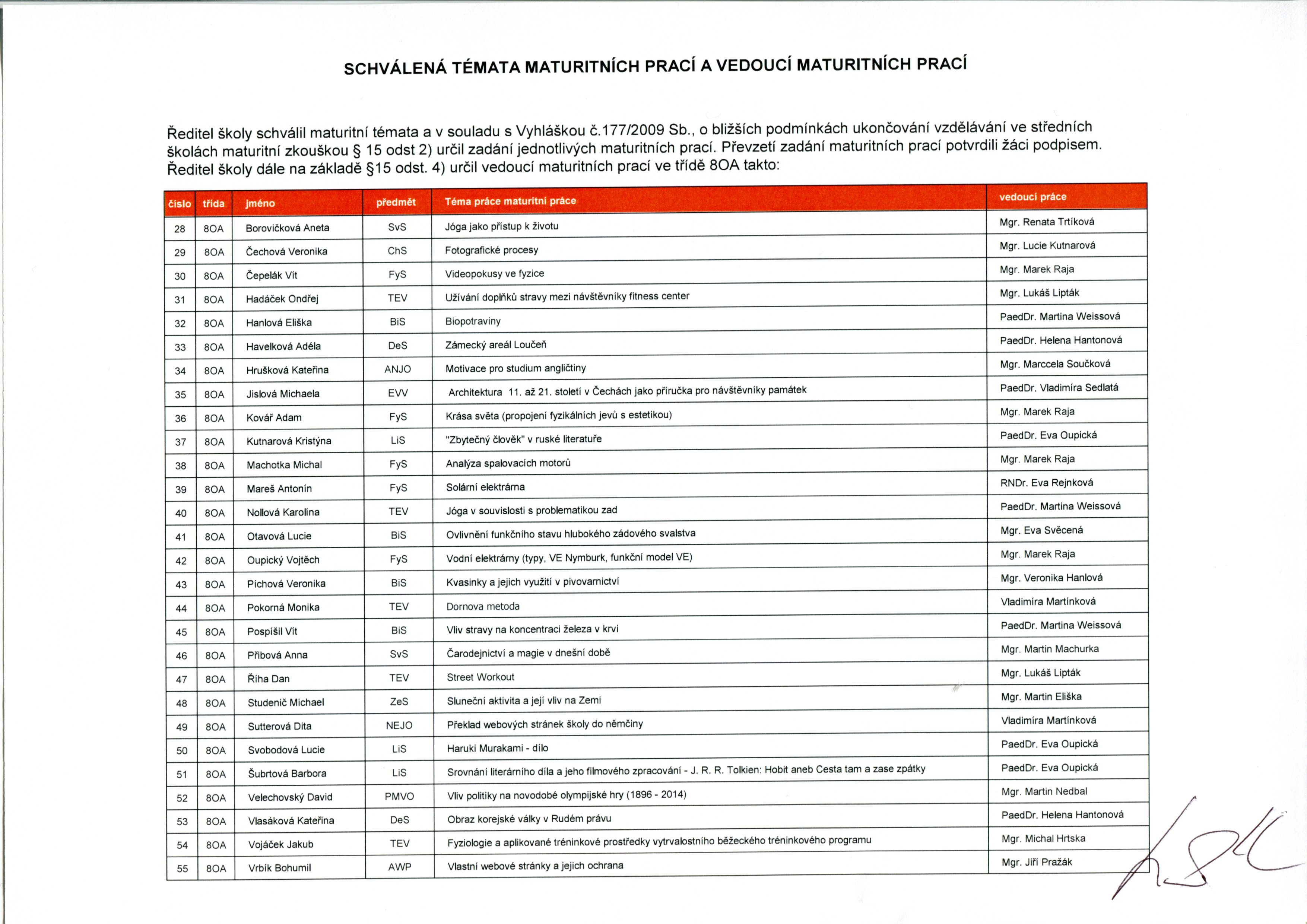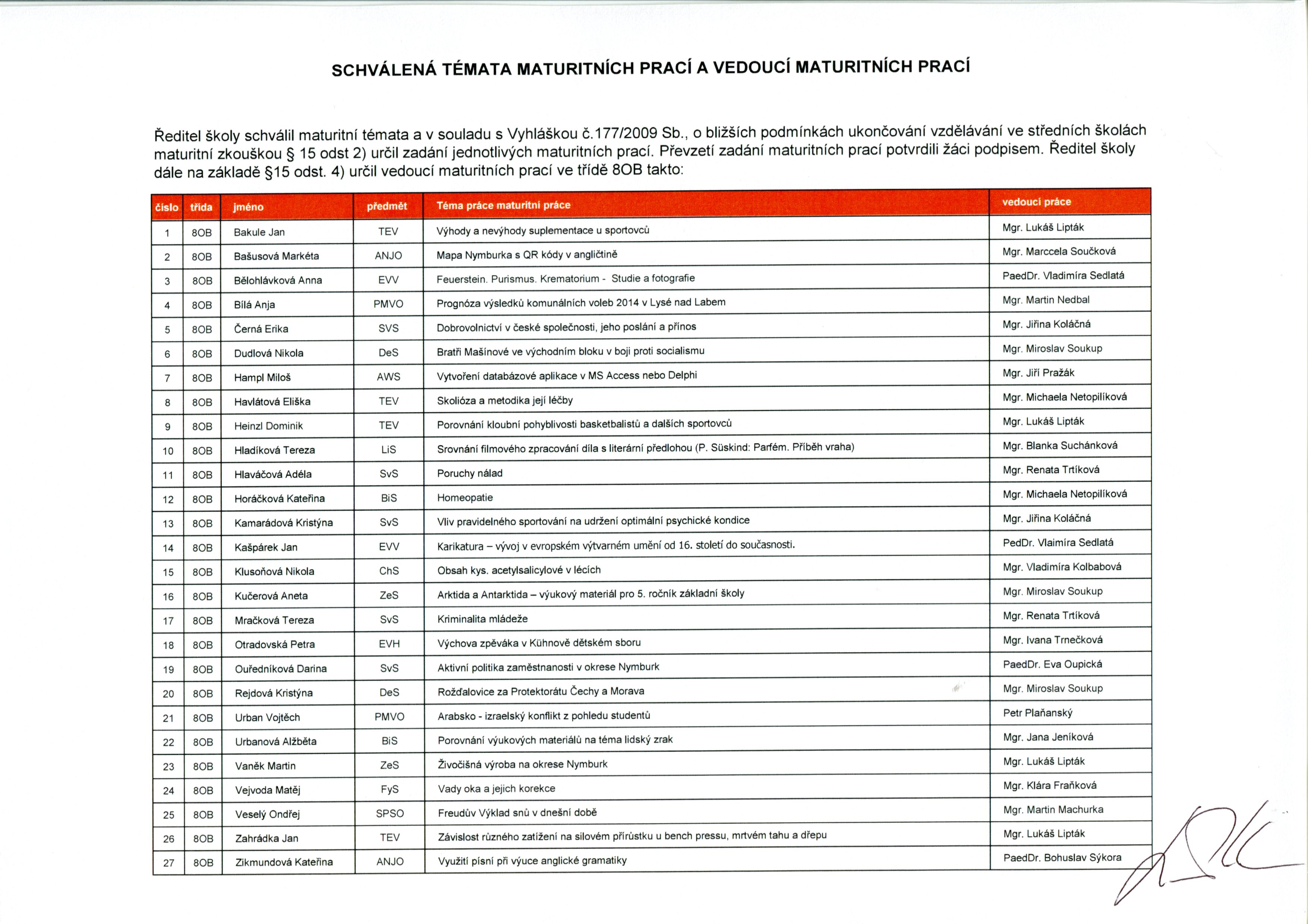 Ředitel školy schválil maturitní témata a v souladu s vyhláškou č. 177/2009 Sb., o bližších podmínkách ukončování vzdělávání ve středních školách maturitní zkouškou, § 15 odst 2) určil zadání jednotlivých maturitních prací. Ředitel školy dále na základě § 15 odst. 4) určil vedoucí maturitních prací v třídách 4A, 8OA, 8OB.