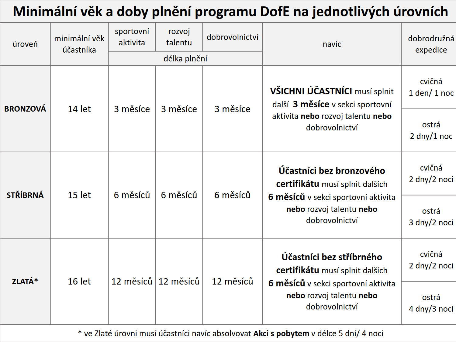 Program probíhá ve třech úrovních - bronzová, stříbrná a zlatá. Tyto úrovně se liší počtem měsíců, během kterých je nutné plnit vytyčené cíle, a dále podmínkami expedice. U zlaté úrovně přibývá navíc tzv. akce s pobytem. Délku jednotlivých programů a další podmínky naleznete v přiloženém dokumentu.