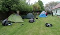 Po příchodu na chatu jsme postavili stany a chvíli si jen užívali, že máme volno. Kluci zatím nachystali dříví na oheň. Potom jsme se pustili do vaření těstovin k večeři. Část naší první dávky sice při slévání skončila na zemi, ale naštěstí nám těstoviny ještě zbyli, a tak jsme si dovařili další. Pak už jsme jen chvíli pobyli u táboráku, kde jsme opekli pár buřtů a topinek.