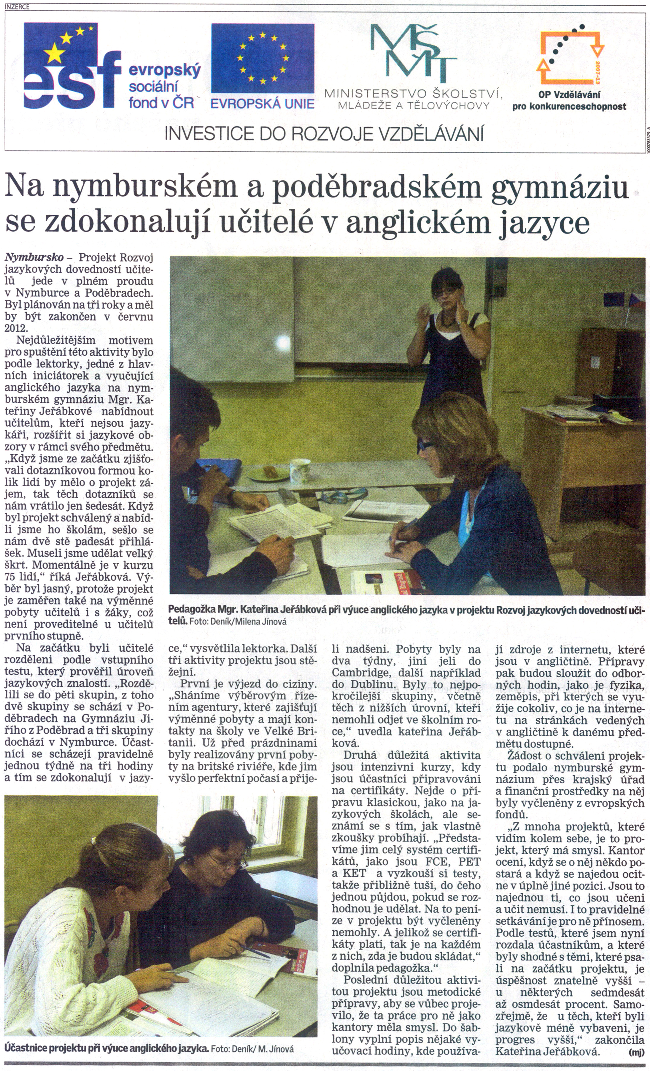 V úterním vydání nymburského deníku 18/10/2011) je věnován velký prostor článku, kterým Deník informuje o projektu Gymnázia Nymburk. Určitě stojí za přečtení!
