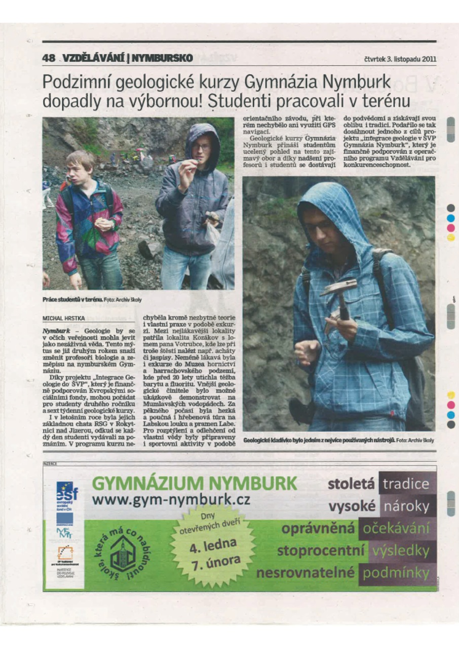 V průběhu listopadu započalo období, v němž se školy obracejí na potenciální uchazeče o studium, a seznamují je s podmínkami studia. K tomu účelu slouží burzy škol, dny otevřených dveří na školách, prezentace škol v tisku a také cílená inzerce. Vstříc školám vycházejí noviny speciálními přílohami zaměřenými na vzdělávání. I v letošním roce využila naše škola tuto možnost a o pozornost žáků devátých a pátých tříd a jejich rodičů se ucházela článkem v příloze Vzdělávání Nymburského deníku a pozvánkou na dny otevřených dveří.